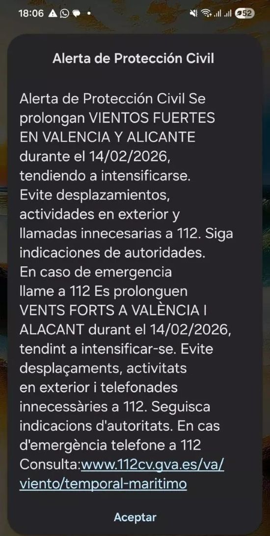 Todos los móviles de la provincia han pitado al unísono: a las 18:10 horas de esta tarde un Es-Alert ha sido enviado a la población para advertir de las fuertes rachas de viento huracanado que está previsto para este sábado 14 de febrero en la provincia de Alicante, que se encuentra en aviso naranja. Una situación que ha obligado a la suspensión de actos de carvaval y de encuentros deportivos.