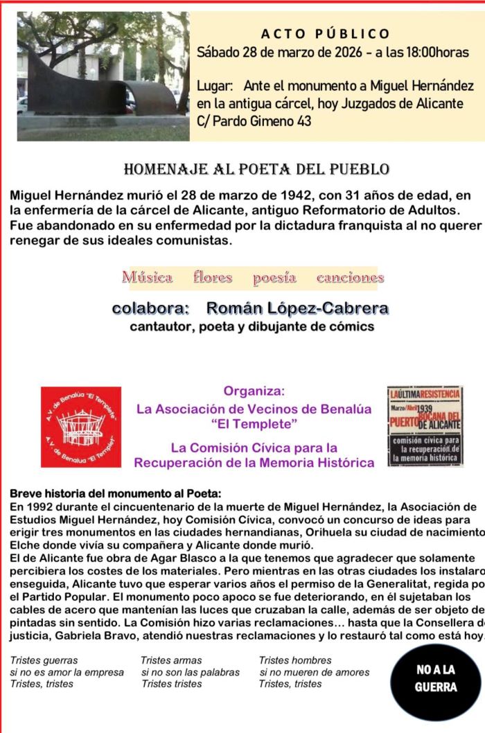 El día 28 de Marzo a las 18 Horas en el monumento a M. Hernández en la Antigua Cárcel, hoy Juzgados. Calle Pardo Gimeno, 43.