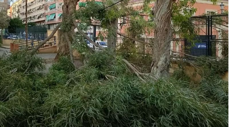 Una rama de eucalipto se ha desprendido en la tarde del martes en el barrio alicantino de Benalúa. El incidente se ha producido en la plaza del Grupo Escolar, junto a una zona de juegos infantiles, a las 19:00 horas, aunque no ha tenido consecuencias personales.