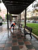 El Ayuntamiento realiza una limpieza a fondo y poda coordinada en la Plaza de Benalúa